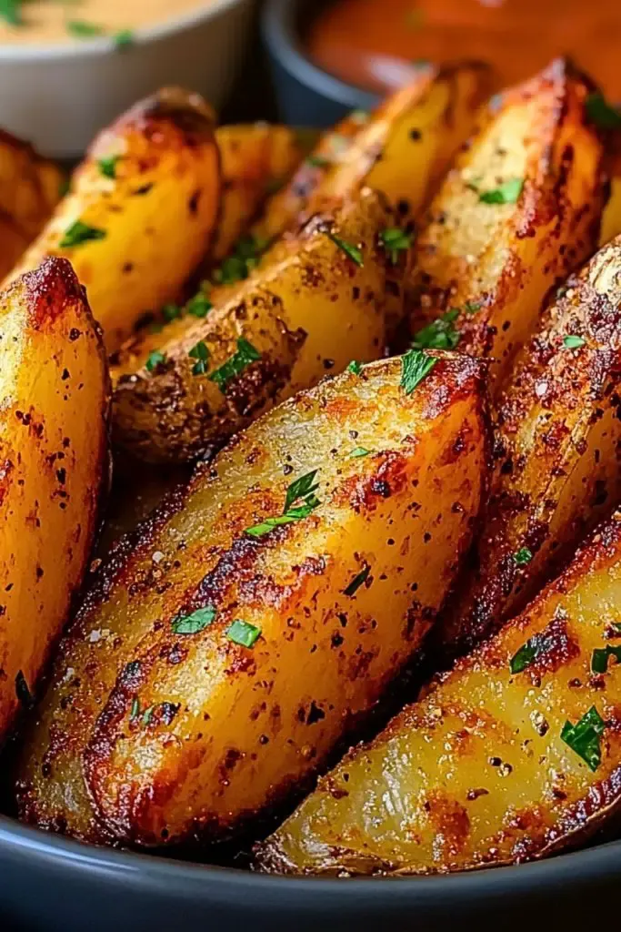 Transfer the cooked wedges to a serving dish. Garnish with fresh parsley for a burst of color and extra flavor. Serve hot with your favorite dipping sauces like ketchup, garlic aioli, or spicy mayo.