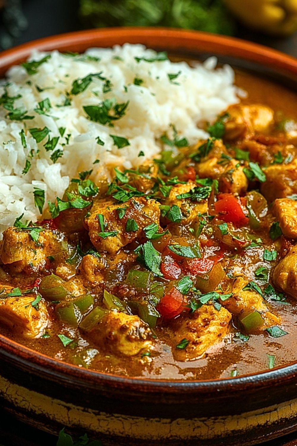 Spoon the chicken etouffee over a bed of warm cooked rice. Garnish with chopped green onions and parsley for a fresh, vibrant finish.
