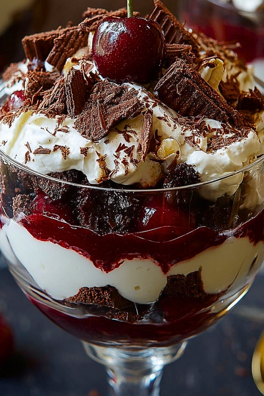Cherries are the heart of this trifle. Whether you use jarred sour cherries, fresh cherries cooked down, or cherry pie filling, they bring sweetness and a slight tartness that cuts through the richness of the chocolate and cream.
