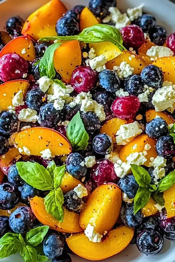 A refreshing and colorful summer salad made with juicy blueberries, ripe peaches, creamy feta cheese, and aromatic basil. Perfect as a side dish or a light main, this salad delivers sweet, salty, and herbal notes in every bite.