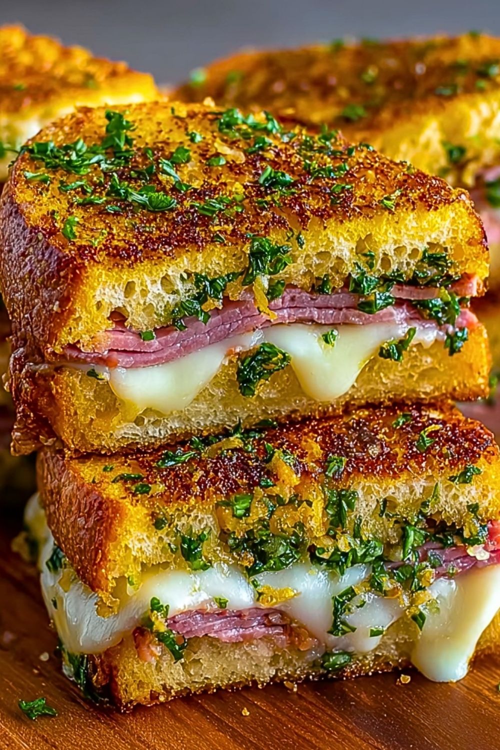 Use thick-cut rustic or sourdough bread for the best texture—it needs to stand up to the garlic butter and hold the fillings without getting soggy. Let the butter come to room temperature before mixing it with garlic and herbs to make spreading easier. Layer the cheese both under and over the meat to lock in moisture and ensure a perfect melt. Keep the heat at medium-low; this prevents the bread from burning before the cheese melts. Lastly, press the sandwich slightly with the spatula while cooking to help everything fuse together into a glorious, gooey stack.