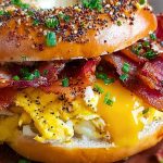 Imagine biting into a toasted everything bagel layered with creamy scrambled eggs, crispy bacon, and melted cheddar cheese—all perfectly balanced between crunchy and gooey. The textures collide in the best way, while a sprinkle of fresh chives adds a touch of brightness. It's hearty, comforting, and endlessly satisfying.