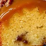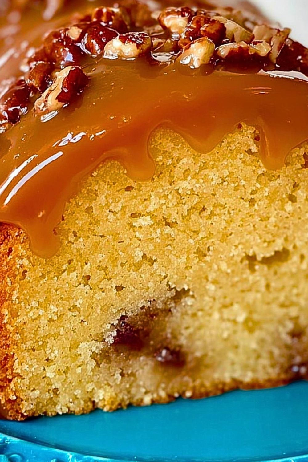 Once the cake is fully cooled, drizzle the caramel glaze generously over the top, letting it drip down the sides. Top with extra chopped or whole pecans if desired.