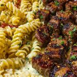 Steak Bites and Cheesy Rotini in Garlic Parmesan Sauce