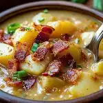 Ladle the hot soup into bowls. Top generously with crispy bacon, shredded cheddar cheese, and a sprinkle of fresh chives or green onions. Serve immediately and enjoy!