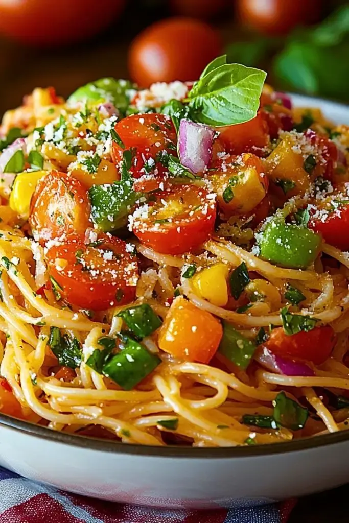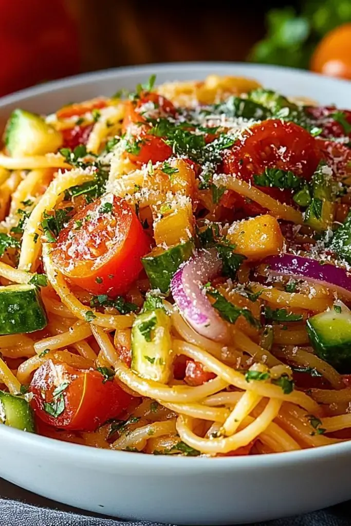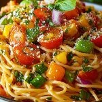 Vibrant, zesty, and brimming with garden-fresh flavors, California Spaghetti Salad is like sunshine in a bowl. This colorful pasta salad is a refreshing mix of crisp vegetables, tender spaghetti noodles, and a tangy Italian-style dressing. It’s the ultimate side dish for warm-weather gatherings or a quick, nourishing lunch you can prep ahead of time. Each bite brings you a balance of textures—juicy cherry tomatoes, sweet bell peppers, crunchy cucumbers, and the slight snap of red onion. It’s finished with a sprinkle of Parmesan and fresh herbs to add depth and brightness.