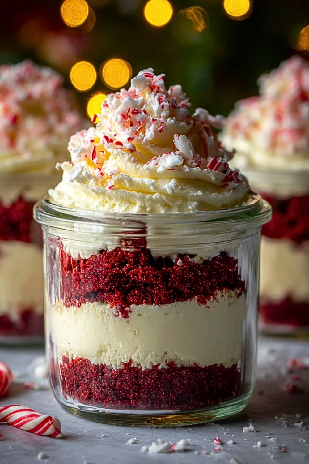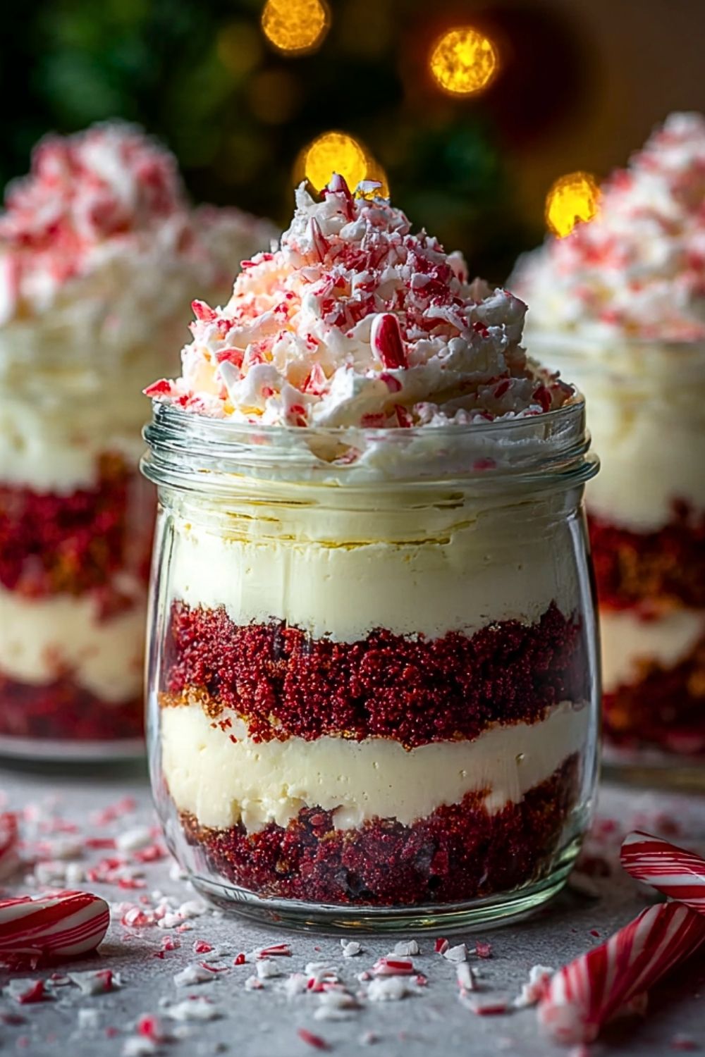 Start with a layer of red velvet cake crumbs at the bottom of each jar. Follow with a thick spoonful of the cheesecake filling, smoothing it slightly. Add another layer of cake, more filling, and finally top with a generous sprinkle of crushed candy canes.