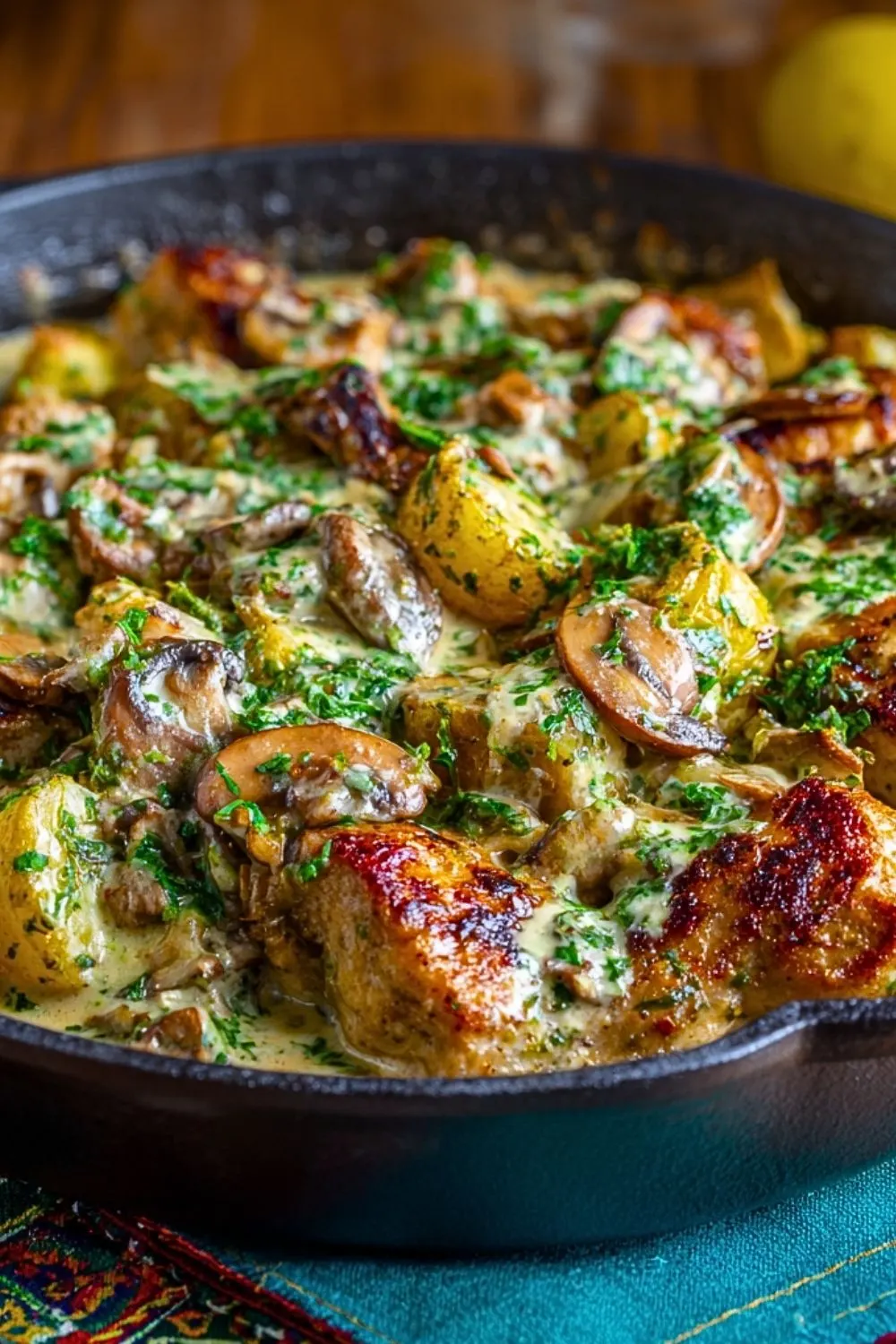 Golden, crispy potatoes drizzled with a whisper of hot honey meet a velvety garlic mushroom Alfredo that coats tender chunks of chicken in rich, herb-infused …