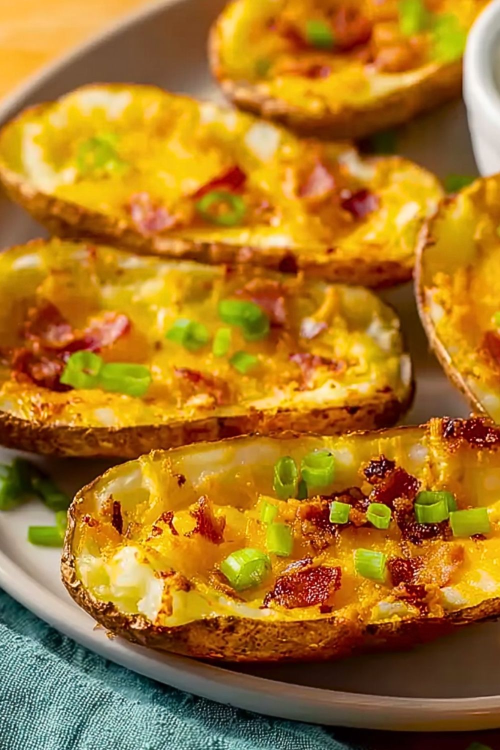 This recipe hits that perfect balance between comfort and convenience. It’s simple to put together, doesn’t require fancy ingredients, and tastes like something you’d get at a great pub. The skins get golden and crisp in the oven, while the cheese melts into gooey perfection. Topped with bacon and scallions, each bite is full of rich, savory flavor with a hint of freshness.