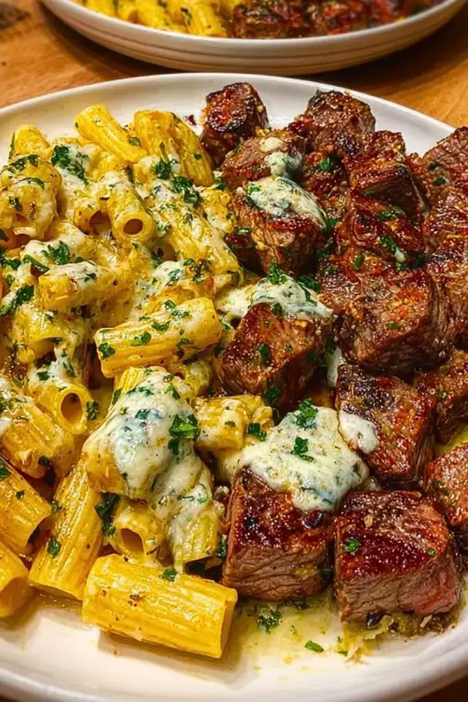 This recipe isn't just delicious—it's an experience. The steak is cooked to golden perfection and drizzled with garlic butter that amplifies every bite. The rigatoni is more than just a side—it’s coated in a rich blend of melted cheeses that hugs every ridge of the pasta. It’s one of those dishes where every component is a star, and when they come together? Pure magic.