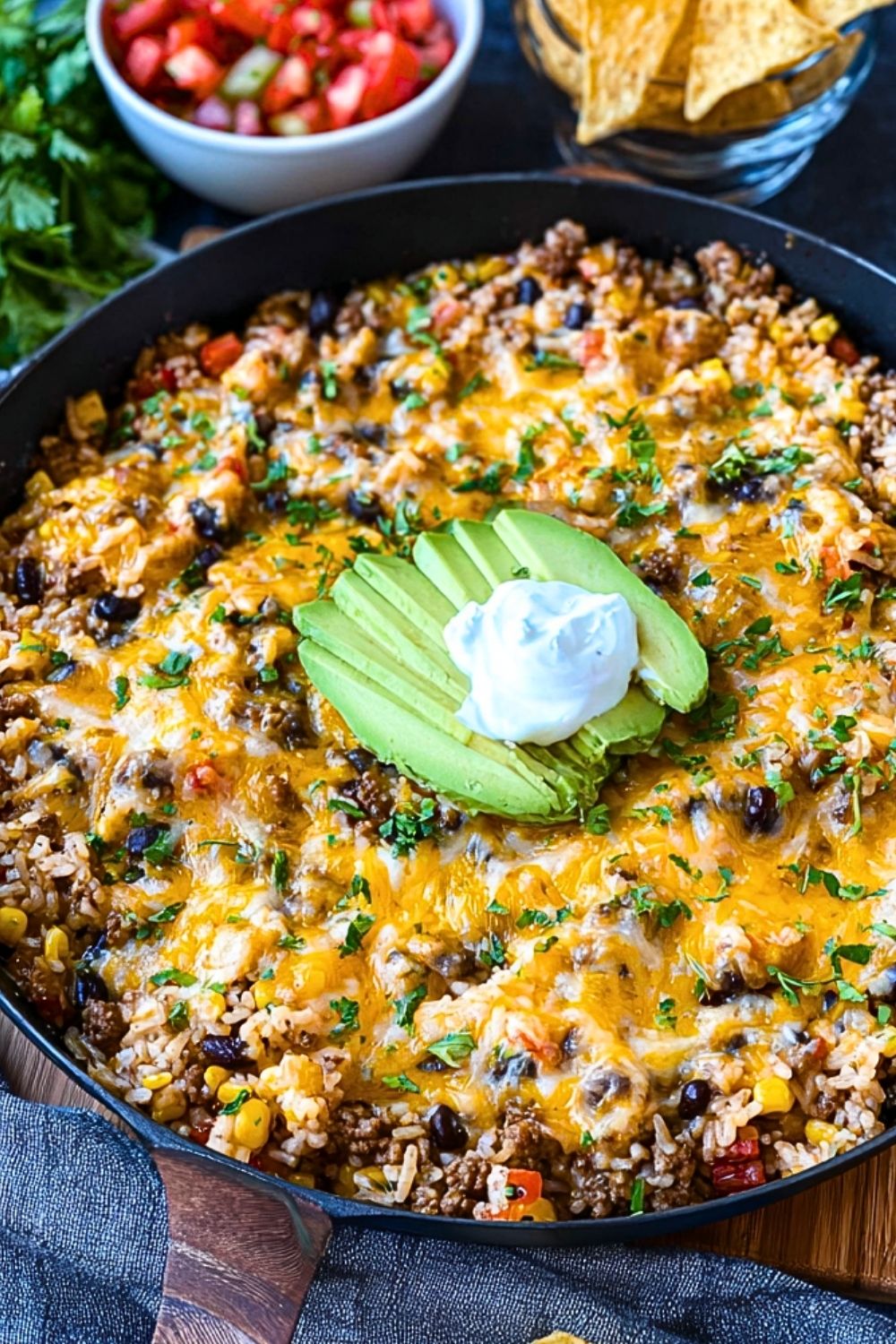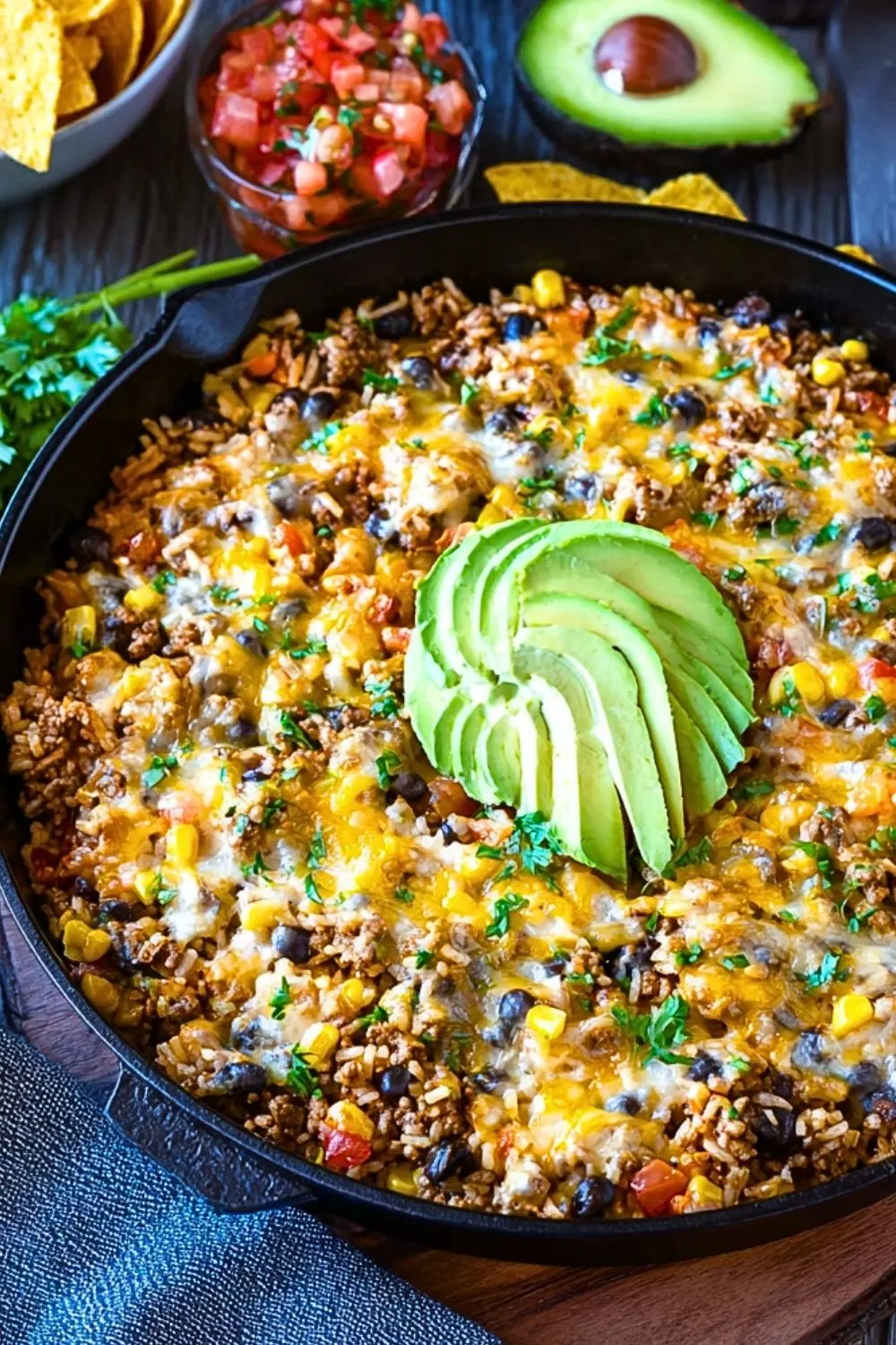 Let me tell you about the one-pan wonder that saves my weeknights again and again — the Cheesy Taco Rice Skillet. When I need something fast, filling, and full of flavor, this dish never fails me. It’s a perfect balance of Tex-Mex comfort and weeknight convenience. You get the bold flavors of seasoned ground beef, black beans, fire-roasted tomatoes, corn, and fluffy rice — all tied together with gooey melted cheese. And the best part? It’s all cooked in a single skillet, which means less cleanup and more time to unwind.
