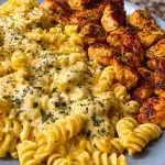 Spoon the cheesy pasta onto a plate and top or serve it alongside the seared chicken. Finish with a dusting of dried parsley or more Italian seasoning for that final touch.