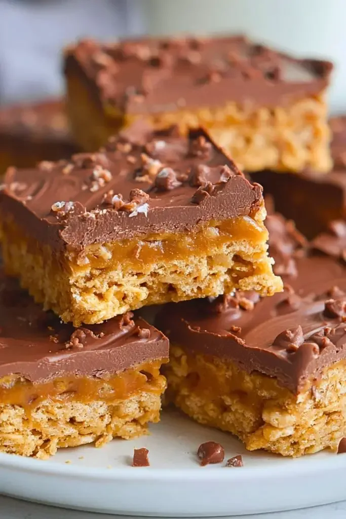These bars check every box: easy to make, packed with texture, and loaded with that sweet-salty combo we all love. They use simple pantry staples, don’t require baking, and set up quickly in the fridge. You can whip them up with kids, serve them at parties, or keep a batch in the freezer for emergency dessert situations. The glossy chocolate-peanut butter layer on top gives them that classic, indulgent finish that makes everyone ask for seconds.