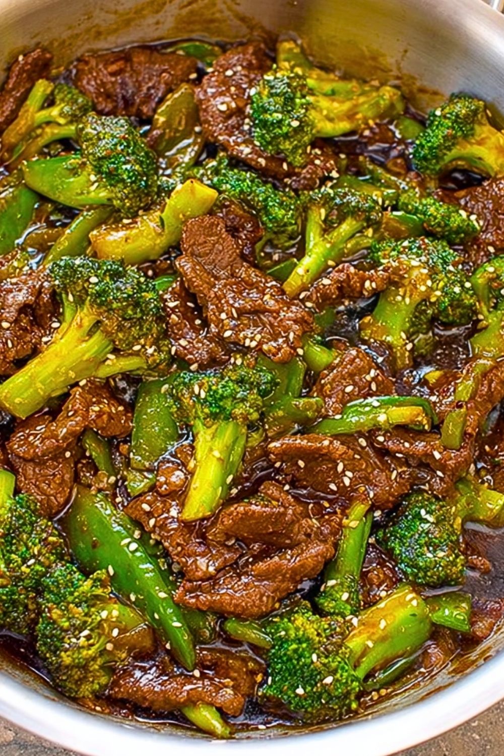 Return the beef to the pan with the broccoli. Pour in the sauce and stir everything together to coat well. Let it simmer for 2–3 minutes so the sauce thickens slightly and clings to every piece.