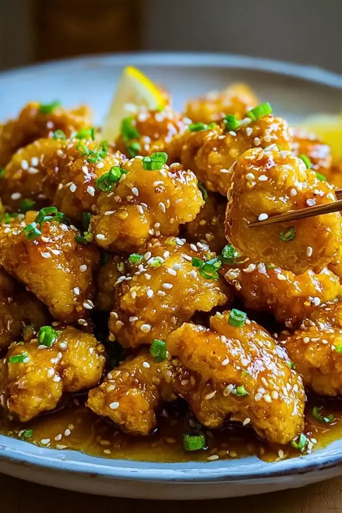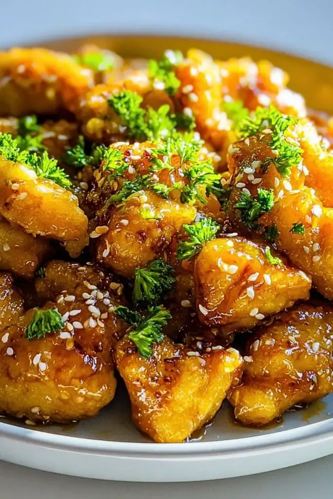 Transfer the coated chicken to a serving plate. Sprinkle generously with toasted sesame seeds and chopped parsley or green onions. Serve hot and enjoy the perfect harmony of citrus and crunch!