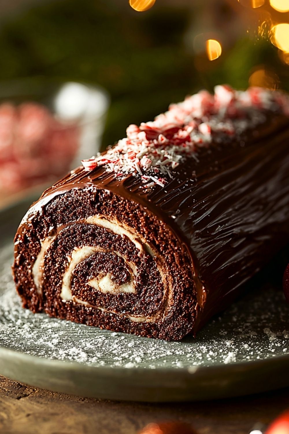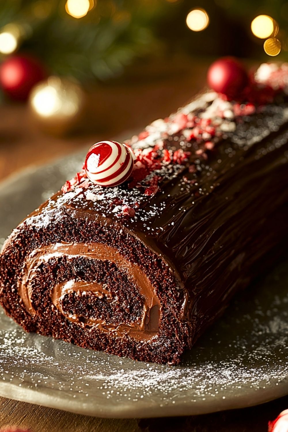 Refrigerate the Yule log for at least 1 hour to set the ganache. Before serving, sprinkle with festive red decorations or a dusting of powdered sugar for a snow-dusted effect.