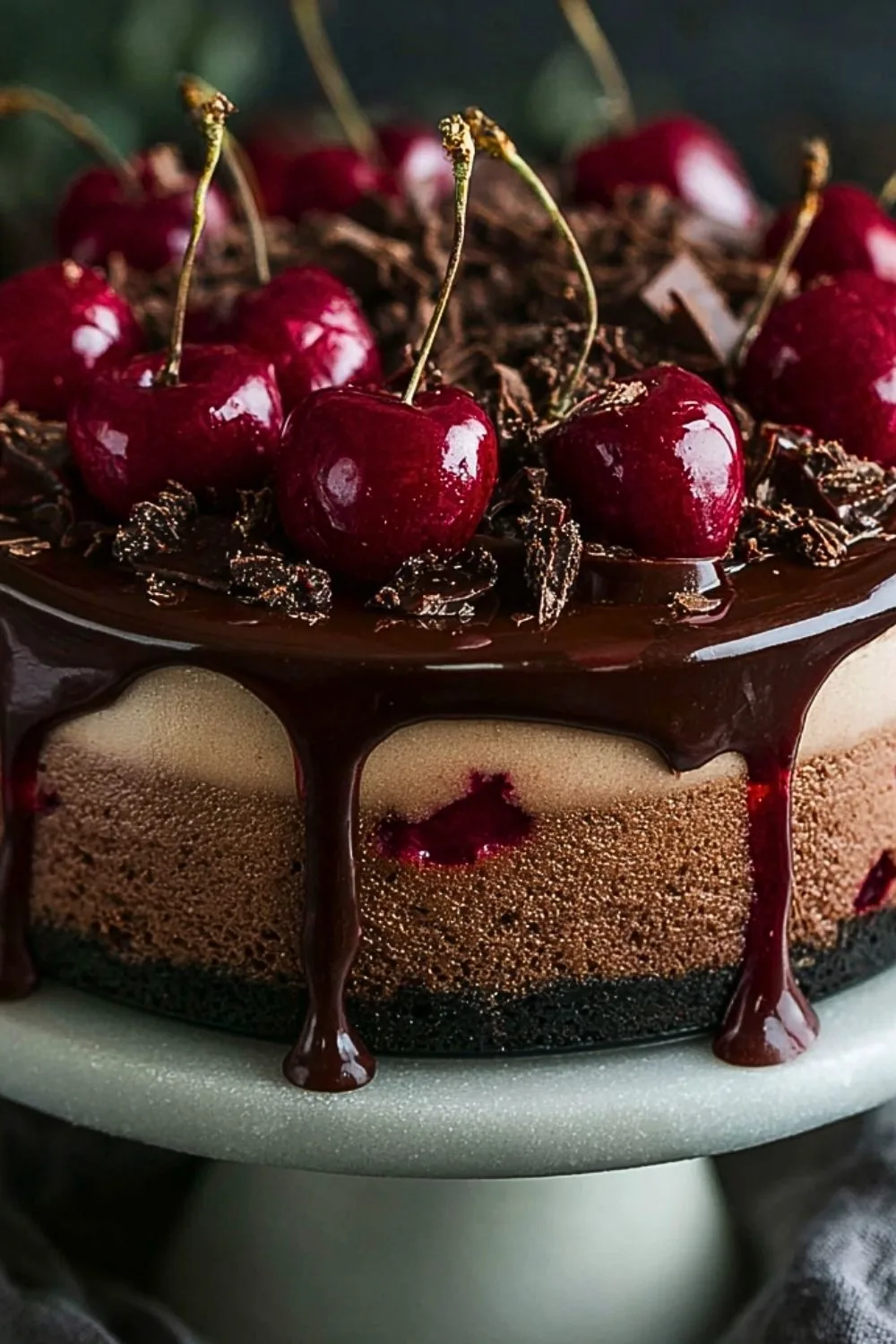Keywords: chocolate cherry cheesecake, elegant dessert, easy baking recipe, cheesecake ideas, cherry topping, oreo crust, holiday cheesecake