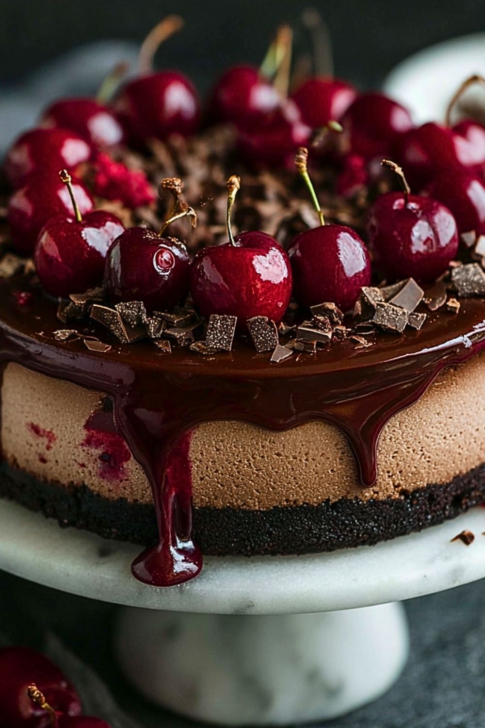 Keywords: chocolate cherry cheesecake, elegant dessert, easy baking recipe, cheesecake ideas, cherry topping, oreo crust, holiday cheesecake
