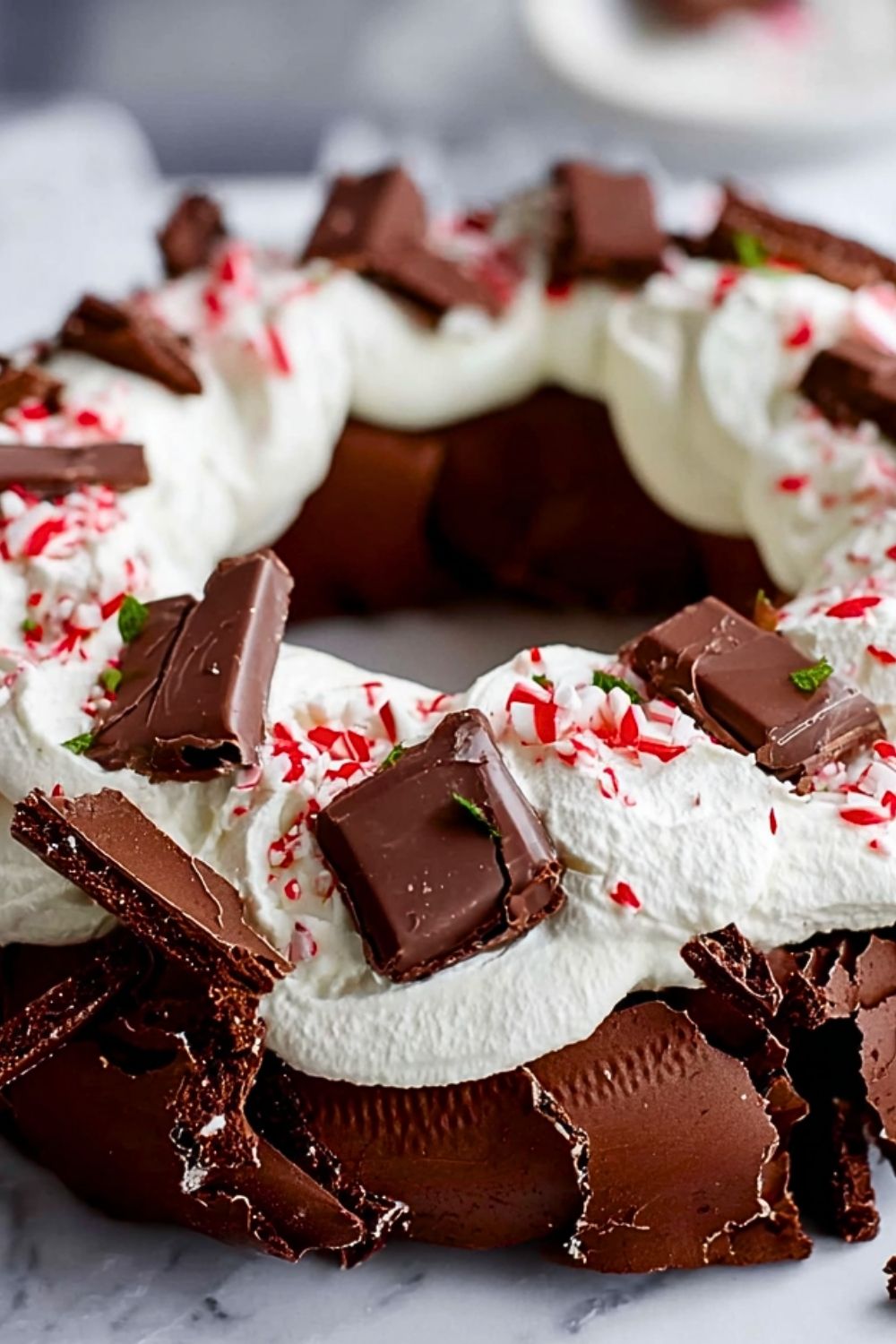 Just before serving, top the pavlova wreath with generous swirls or piped mounds of whipped cream. Sprinkle crushed peppermint candies over the top and press chocolate shards or curls gently into the cream. Add extra peppermint for sparkle if desired.