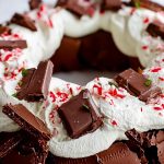 8. Just before serving, top pavlova with whipped cream, crushed peppermint, and chocolate shards.