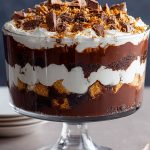 A Chocolate Toffee Trifle is pure dessert decadence. With luscious layers of rich chocolate pudding, moist chocolate cake crumbs, fluffy whipped cream, and chopped toffee candy bars, it’s a showstopper that’s as easy to make as it is irresistible. Served in a glass trifle dish, every layer is a visual treat, promising a heavenly bite in every spoonful.