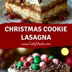 Looking for a no-bake, show-stopping Christmas dessert? This *Christmas Cookie Lasagna* is layered with a chocolate cookie crust, creamy cheesecake filling, a buttery cookie crumble, and festive toppings of whipped cream and red-green M&M’s. It’s a quick dessert perfect for holiday parties, easy dinner ideas, or even a fun winter weekend baking session with the kids. With rich textures and colorful flair, this easy recipe is a must-try addition to your collection of Christmas food ideas.
