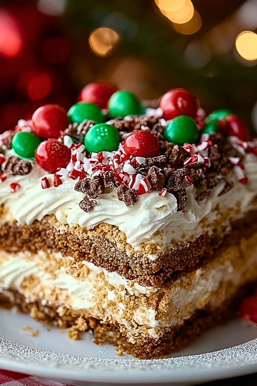 Top the dessert with a layer of whipped topping, either spooned or piped decoratively across the surface. Garnish with red and green M&M’s for a festive touch. Add red sugar sprinkles or nonpareils if desired for extra holiday flair.