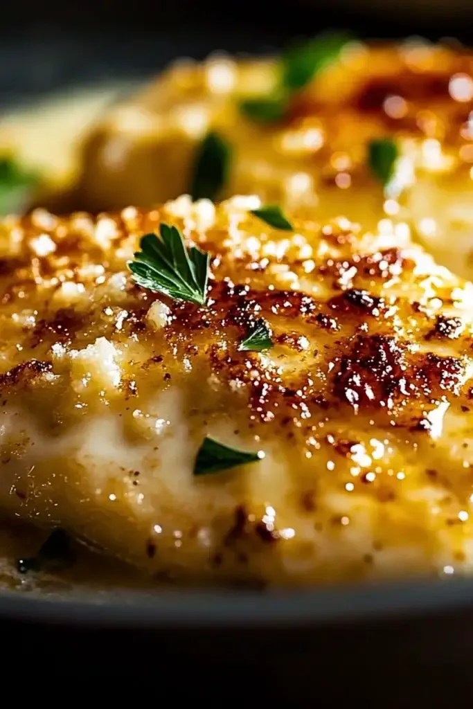Sprinkle chopped fresh parsley over the top for a pop of color and freshness. Serve hot and enjoy every bite of that crispy, cheesy crust and tender chicken beneath it.