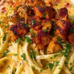 Rich, velvety, and loaded with bold Cajun flair, this Creamy Cajun Chicken Linguine with Spicy Garlic Cheese Sauce is a showstopper dinner that delivers comfort and flavor in every bite. The perfectly grilled chicken—seasoned with smoky, spicy Cajun rub—sits beautifully beside a nest of linguine smothered in a creamy, garlicky cheese sauce that’s laced with a subtle kick of heat. The vibrant specks of chopped parsley and crispy red bits of bacon add freshness and crunch, elevating the entire plate to restaurant-quality status.