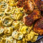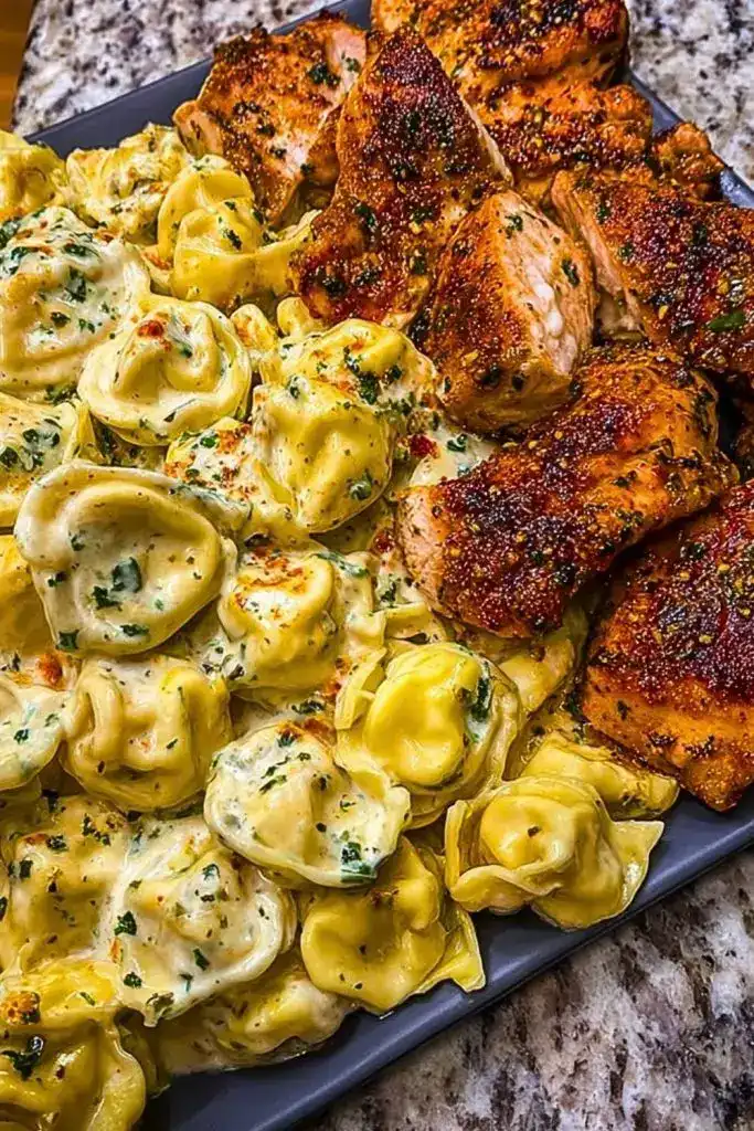 8. Slice the rested chicken into strips or chunks. Serve over the creamy tortellini and garnish with chopped parsley.