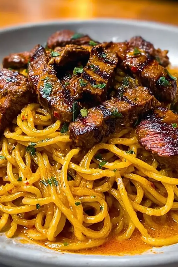 Place the seared beef strips over the creamy Cajun spaghetti. Let them warm through for a minute or two, or stir them gently into the pasta if preferred. Garnish with freshly chopped parsley for a pop of color and freshness.