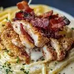 7. Assemble: Plate pasta, top with crispy chicken and chopped bacon. Garnish with parsley and more Parmesan.