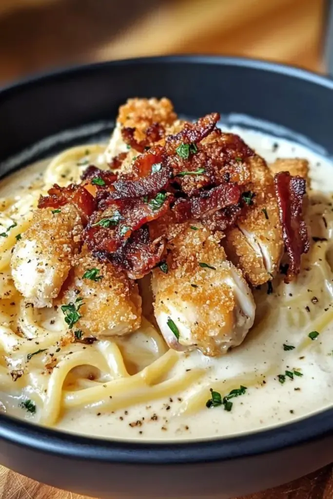 This Creamy Carbonara with Crispy Chicken & Bacon is the ultimate comfort food experience in one dish. Imagine perfectly cooked spaghetti wrapped in a rich, velvety Parmesan cream sauce, layered with golden, crispy chicken tenders and crowned with smoky, crunchy bacon. Every bite delivers that luscious balance of creamy, savory, and crispy textures—making it incredibly satisfying and full of flavor.