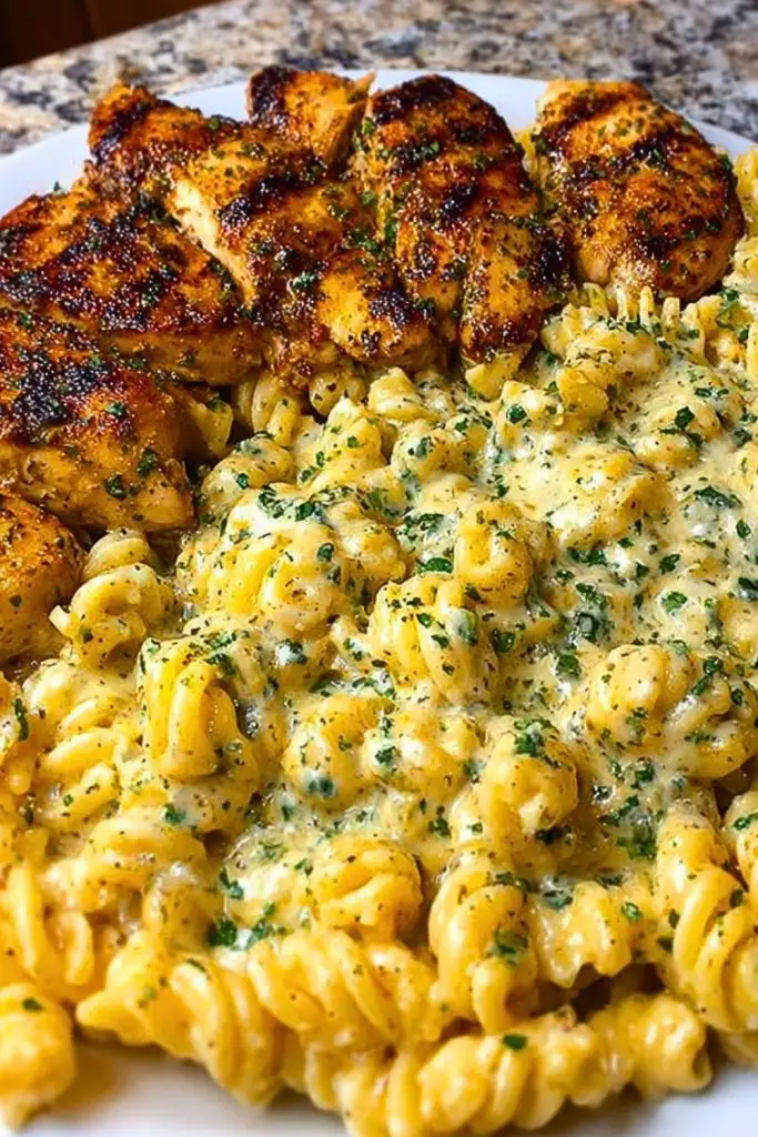 8. Slice the rested chicken and serve over the creamy rotini. Garnish with chopped parsley if desired.