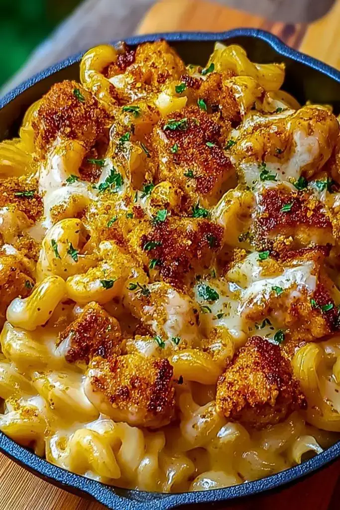 Reheat the mac and cheese gently over low heat on the stovetop or in the microwave. Add a splash of milk to loosen the sauce if it thickens too much. Re-crisp the chicken in an air fryer or oven at 375°F (190°C) for about 5–7 minutes before serving.