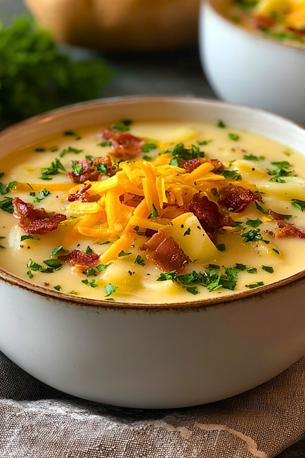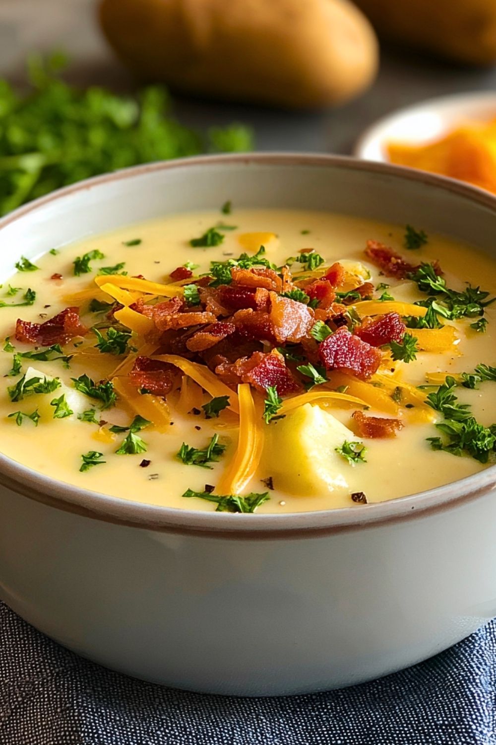 Ladle the soup into bowls and top with the reserved crispy bacon, more shredded cheddar cheese, and chopped fresh parsley or chives. Serve warm with crusty bread or a side salad for a complete meal.