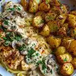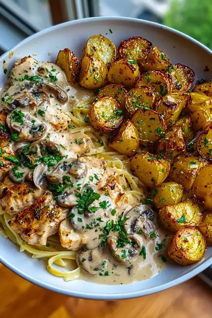 Creamy Mushroom Garlic Chicken Alfredo with Hot Honey Roasted Potatoes is the perfect marriage of indulgent and comforting flavors — tender chicken in a silky, garlicky sauce paired with crispy, sweet-spicy potatoes. It’s a dish that feels special enough for guests but simple enough for a cozy night at home. Every element can be enjoyed together or on its own, making it a versatile favorite worth keeping in your recipe rotation.