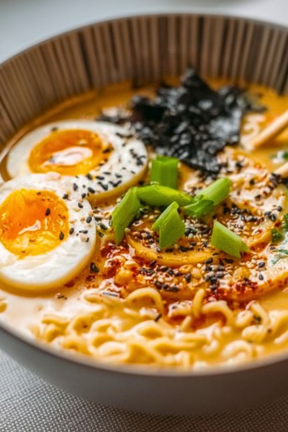Transfer the creamy ramen into a serving bowl. Place the halved soft-boiled egg on top. Garnish with chopped green onions, toasted sesame seeds, and optional seaweed or nori flakes for extra umami.