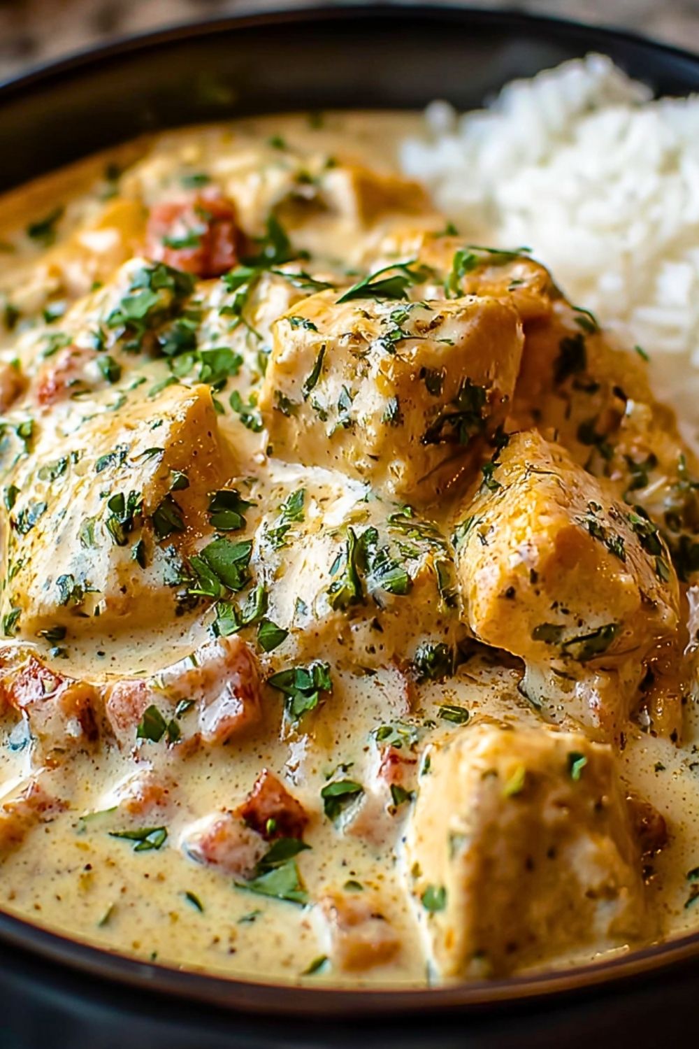 Once the chicken is fully cooked and the sauce has thickened slightly, stir everything gently. Garnish with freshly chopped parsley or herbs, and serve over rice, mashed potatoes, or low-carb alternatives.