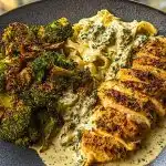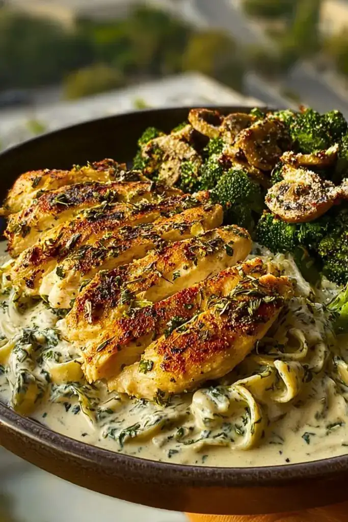 A rich and comforting dish featuring Greek-marinated chicken, creamy spinach-artichoke alfredo, and crispy roasted parmesan broccoli—all brought together with a silky mushroom basil sauce. Perfect for weeknights or special dinners alike.