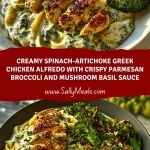 Creamy Spinach-Artichoke Greek Chicken Alfredo with Crispy Parmesan Broccoli and Mushroom Basil Sauce