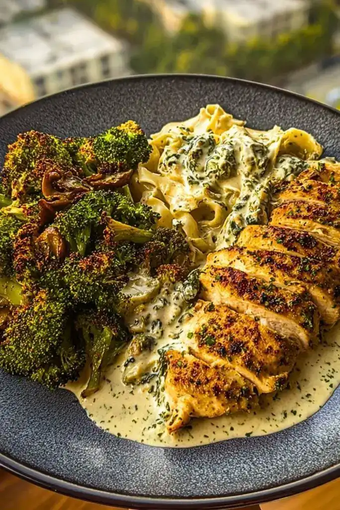 Creamy Spinach-Artichoke Greek Chicken Alfredo with Crispy Parmesan Broccoli is more than just a dinner—it’s a layered, flavor-forward experience. From juicy marinated chicken and velvety basil mushroom sauce to that irresistible golden broccoli, every element is designed to bring balance and comfort. It feels gourmet but is totally doable in your own kitchen. Whether you’re cooking to impress or just craving something special, this dish checks every box.