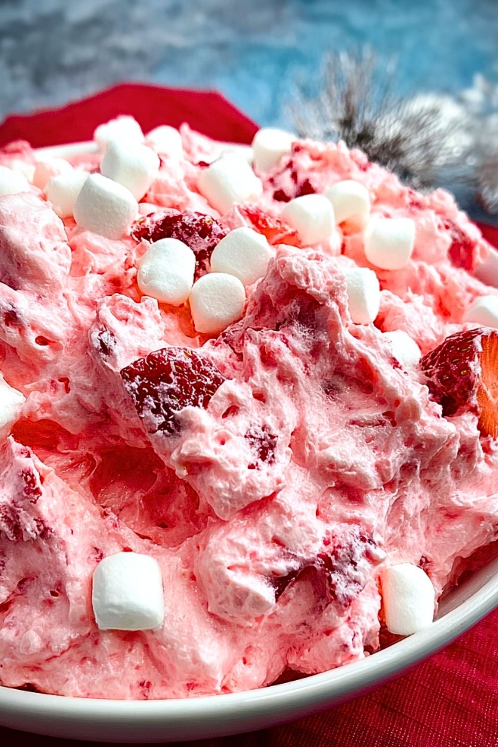 Before serving, give the salad a gentle stir to refresh its texture. Transfer to a serving dish and optionally top with extra marshmallows or fresh strawberry slices for presentation.
