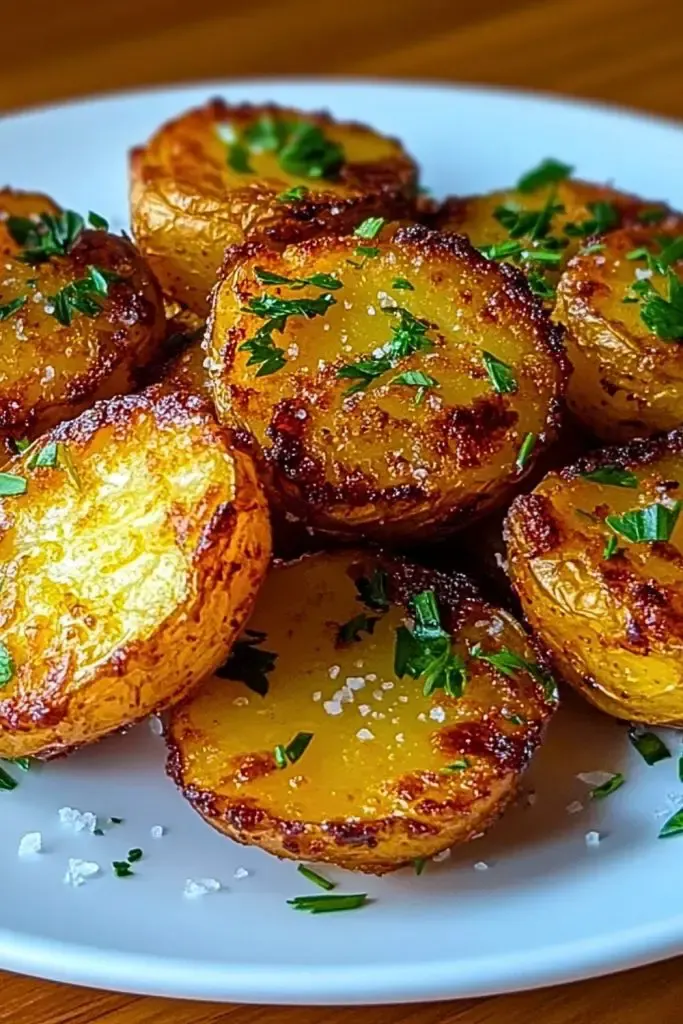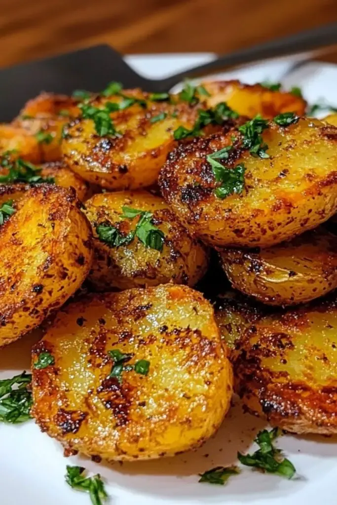 Once the potatoes are golden brown and crispy, transfer them to a serving plate. Sprinkle with freshly chopped parsley and a little extra salt if desired. Serve hot and enjoy!