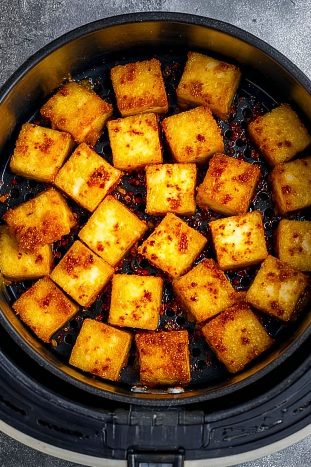 Arrange the tofu cubes in a single layer in the air fryer basket, leaving space between them. Air fry for 12–15 minutes, shaking the basket halfway through. You’re looking for golden, crispy edges and a firm texture.