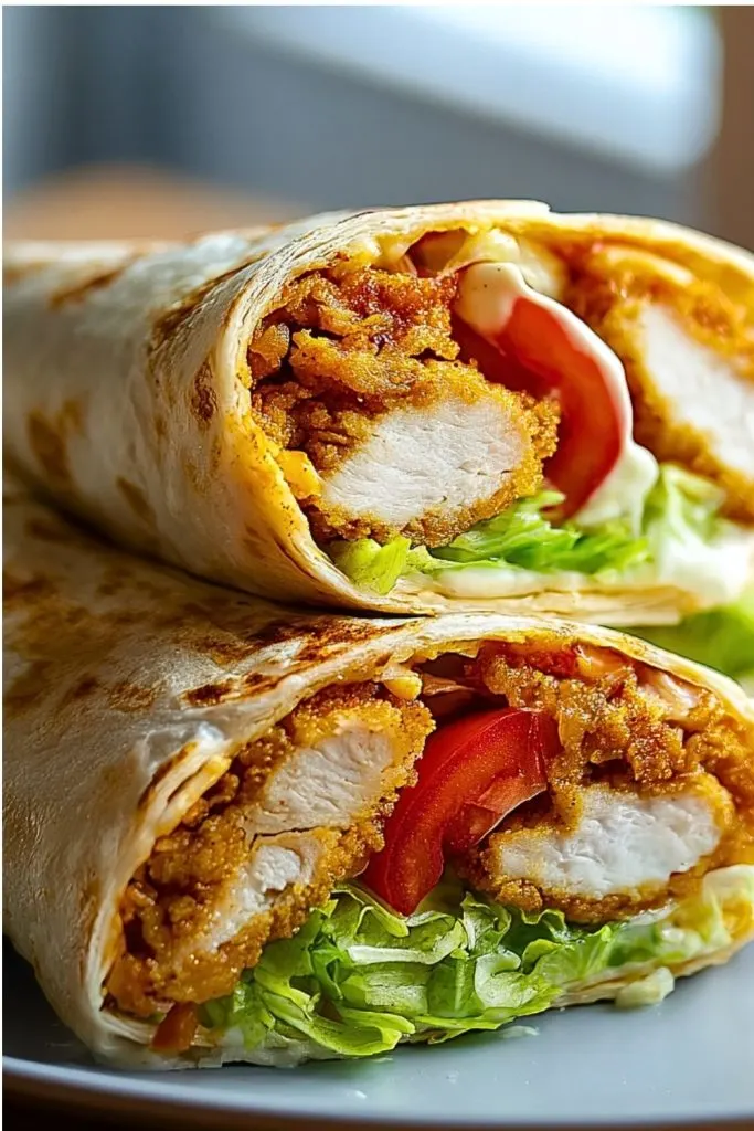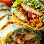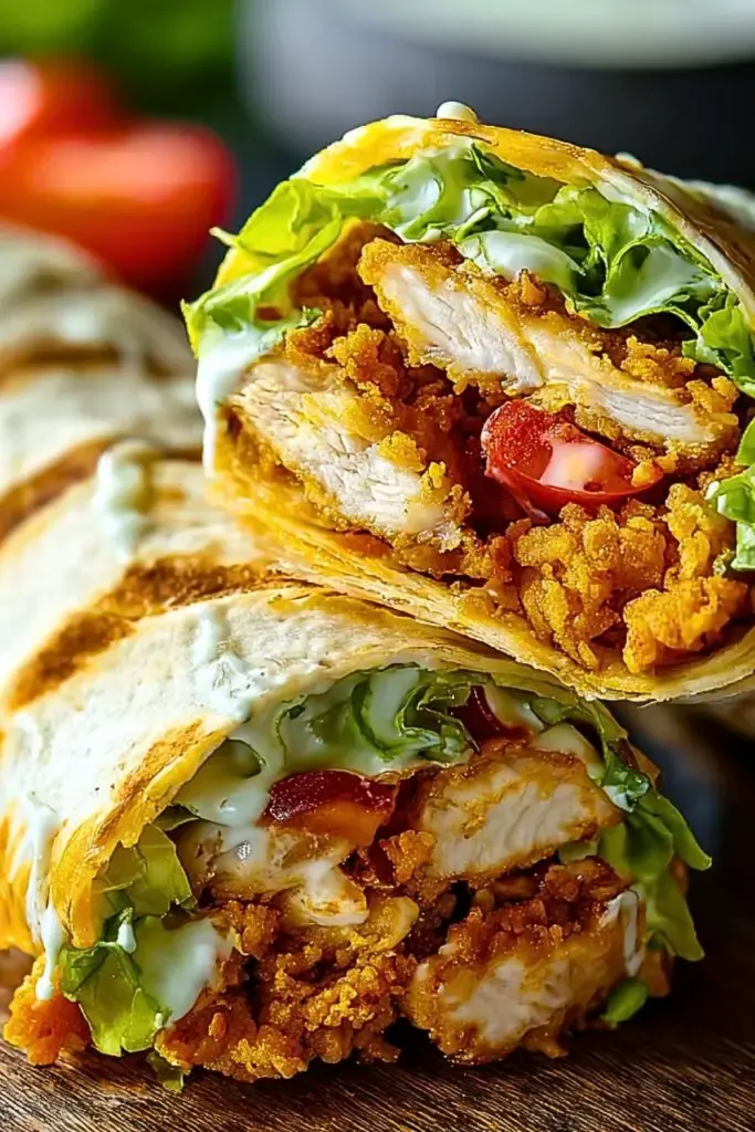 Place each warm tortilla flat on a surface. Layer with a generous portion of lettuce and tomato. Then, slice the crispy chicken into strips and place it over the veggies. Drizzle ranch dressing over the top—don’t be shy with it! The dressing ties everything together and adds that creamy flavor that’s essential for the wrap.