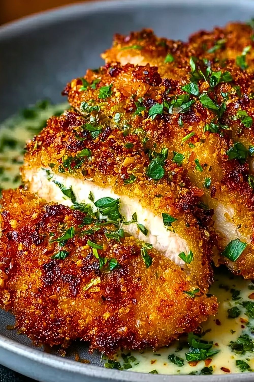 I first made this when I was trying to recreate a restaurant-style chicken at home, and it instantly became a favorite. The crispy coating is rich with Parmesan and seasoned breadcrumbs, while the inside stays juicy. Pair that with a creamy garlic herb sauce and it becomes downright irresistible.