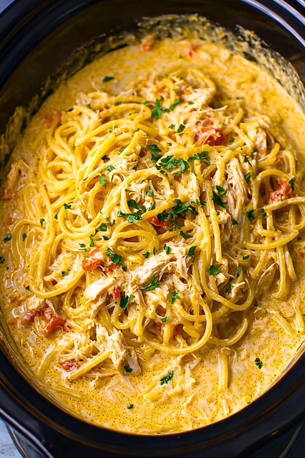 Keywords: crock pot chicken spaghetti, easy dinner, cheesy pasta, comfort food, slow cooker recipe