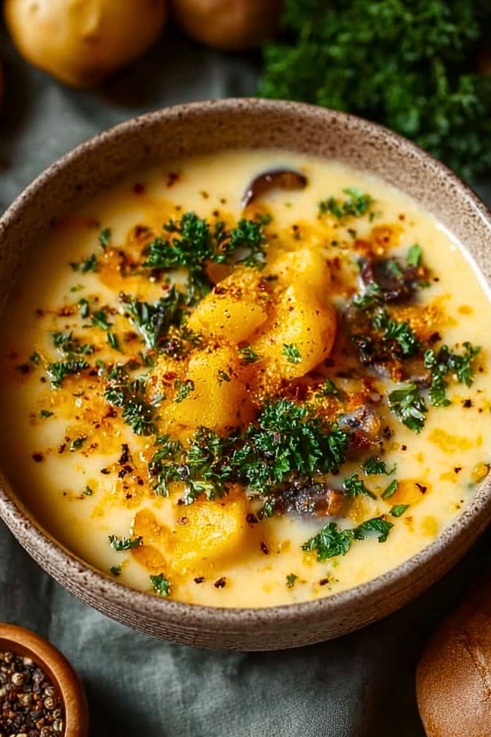 Ladle the soup into bowls and garnish with chopped fresh parsley, cracked black pepper, and any toppings you like—crumbled bacon, more cheese, or toasted croutons work beautifully.
