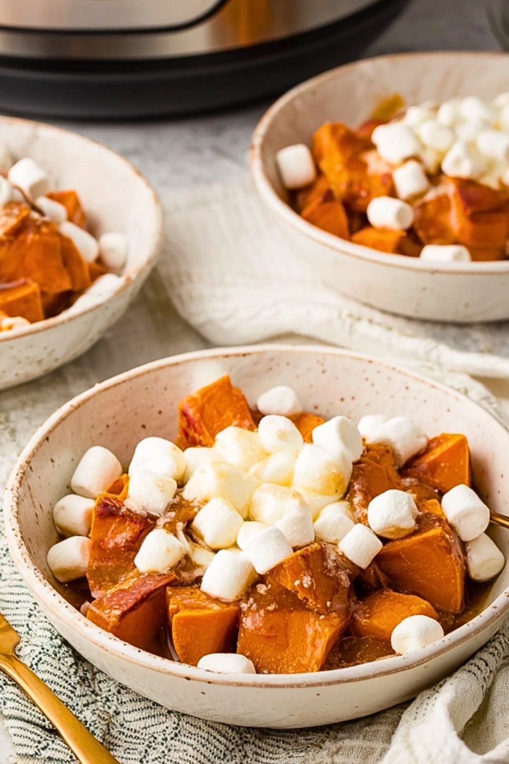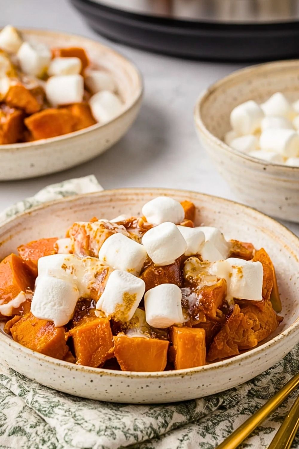 About 10–15 minutes before serving, sprinkle mini marshmallows over the top of the cooked sweet potatoes. Cover and let the marshmallows melt from the residual heat. You can stir them in for a gooey texture or leave them on top for that classic melted look.
